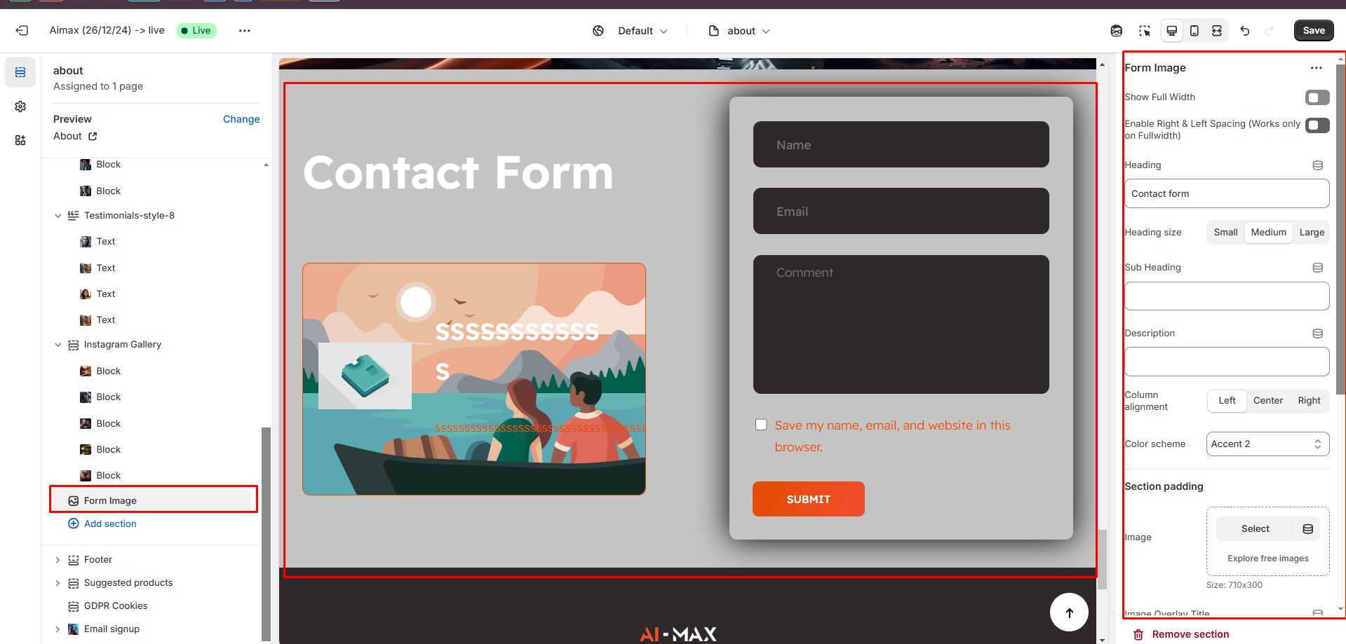 The Form Image Section allows you to display a contact form alongside an image, helping customers easily get in touch while maintaining a visually appealing layout.