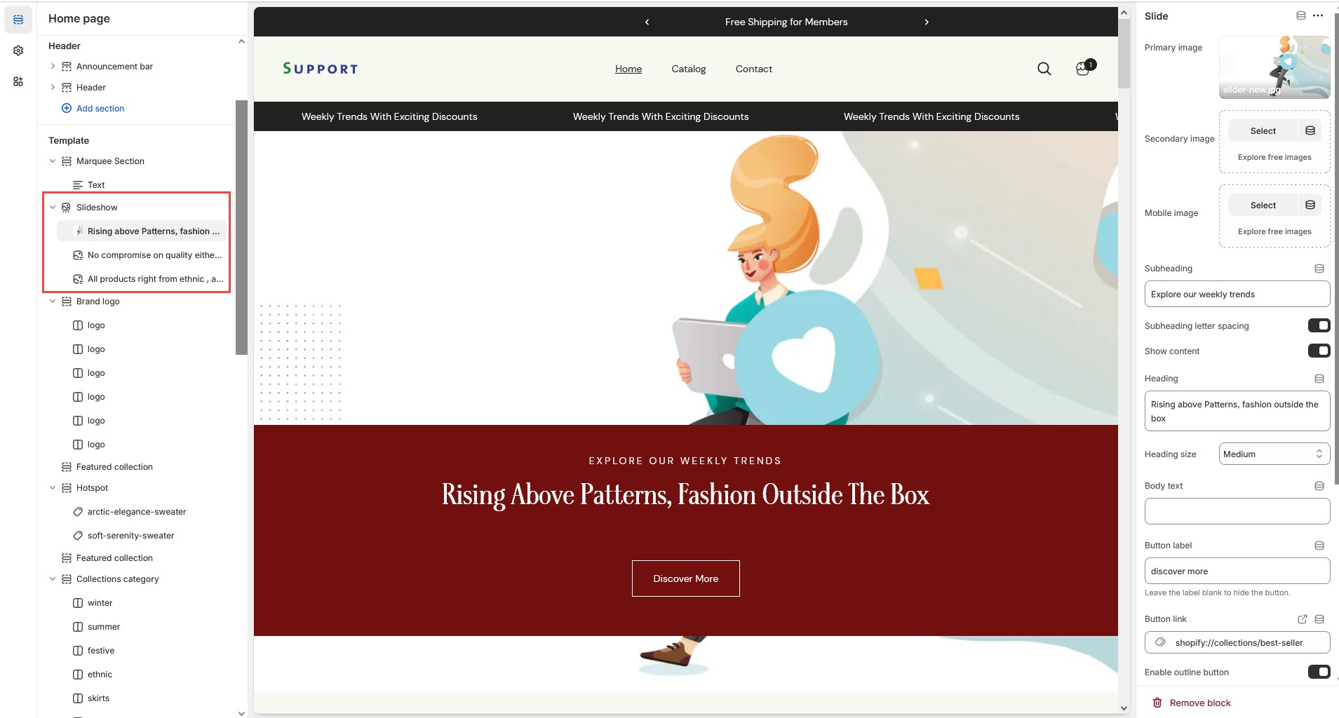 The Slideshow Section allows you to display multiple images or banners in a rotating format, making it ideal for highlighting promotions, featured products, or key brand messages.