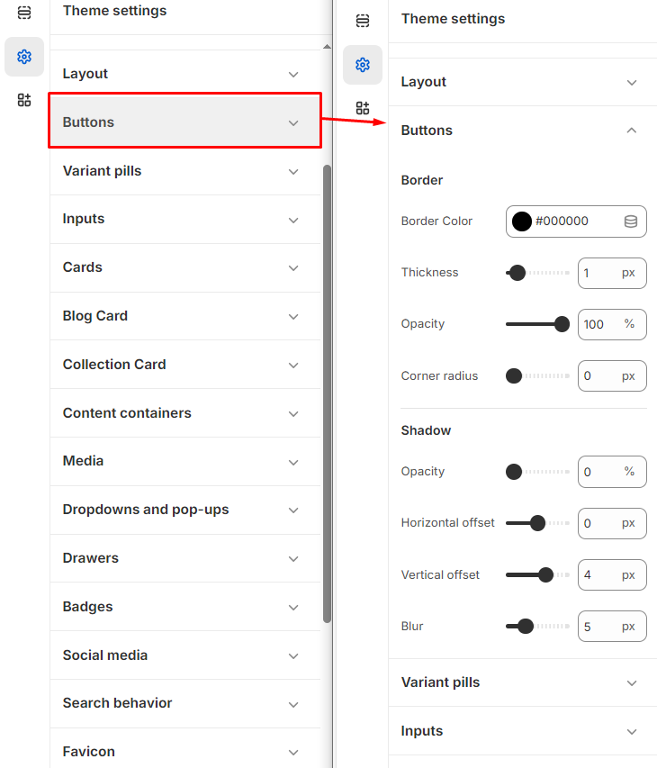 Shadow: In the Shadow section, you can adjust the Opacity, Horizontal offset, Vertical offset, and Blur of the button's shadow. These settings allow you to control how light or dark the shadow appears, as well as its position and softness.This is used to set a box-shadow for the button in CSS. The syntax looks like this:Eg: Box-shadow: [horizontal-offset] [vertical-offset] [blur-radius] [spread-radius] [color];