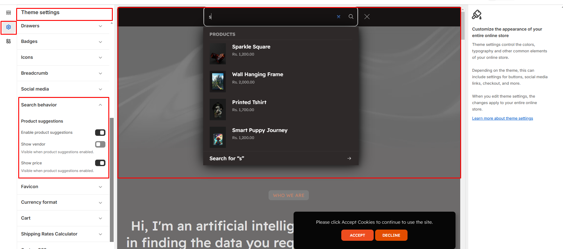 • Enable product suggestions: When the toggle is enabled, product suggestions will appear as users type in the search bar.