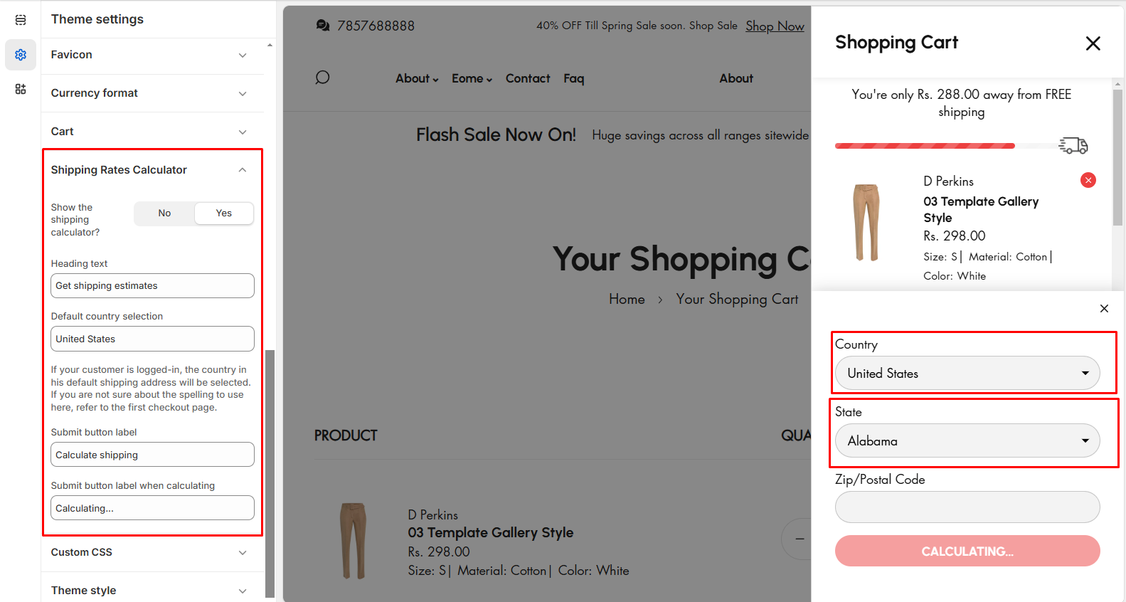 • Country selection: The option allow to enter the default country name in shipping calculator