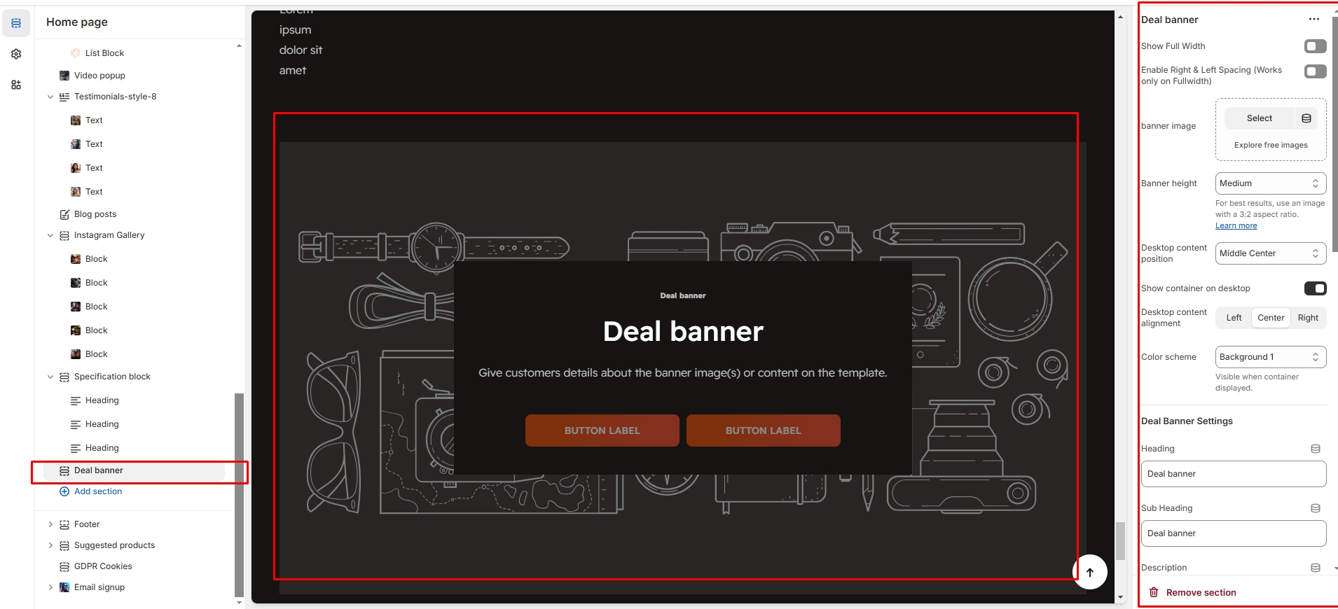 The Deal Banner Section allows you to highlight special offers, limited-time discounts, or featured collections with a countdown timer, images, and promotional content.