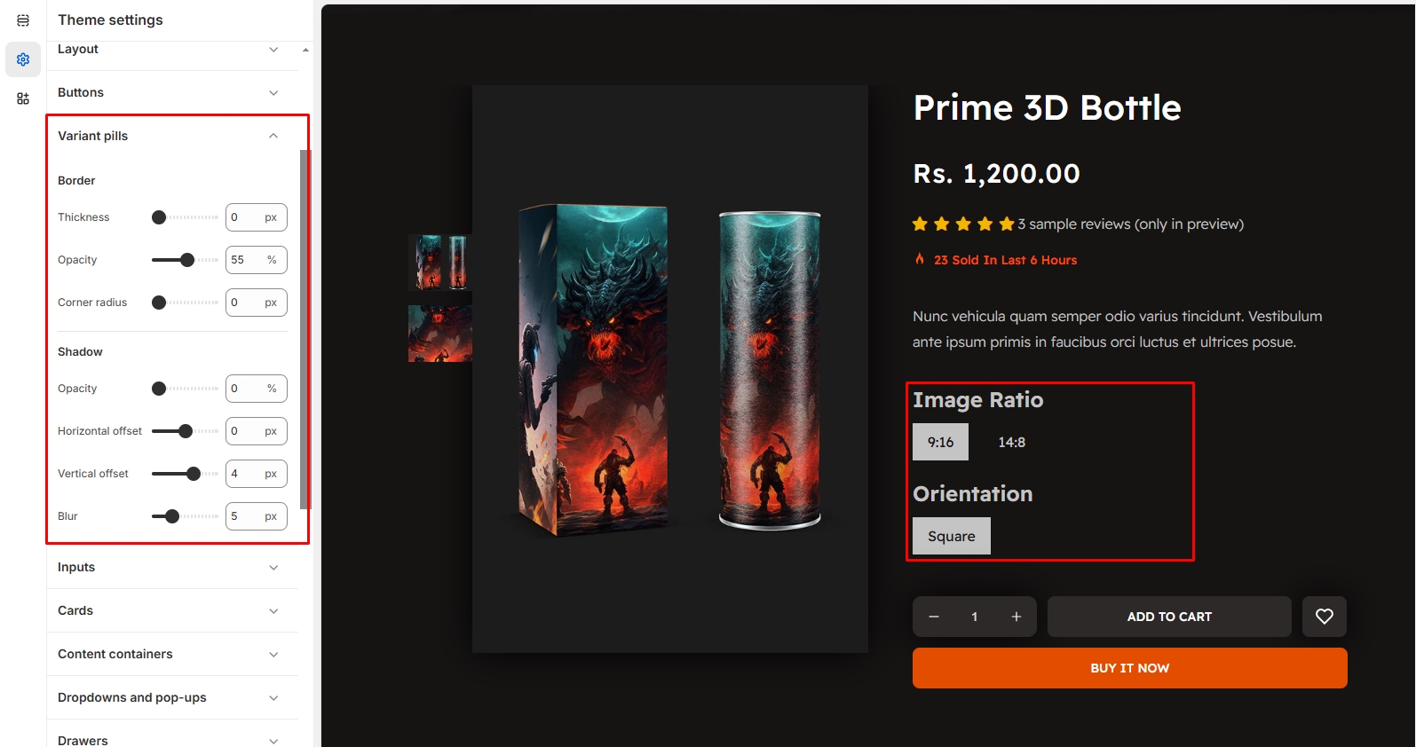 When you adjust the Variant Pills settings in Shopify's theme editor, the following changes occur in the styling of variant buttons on the product page. Below is a breakdown of each option and its effect: