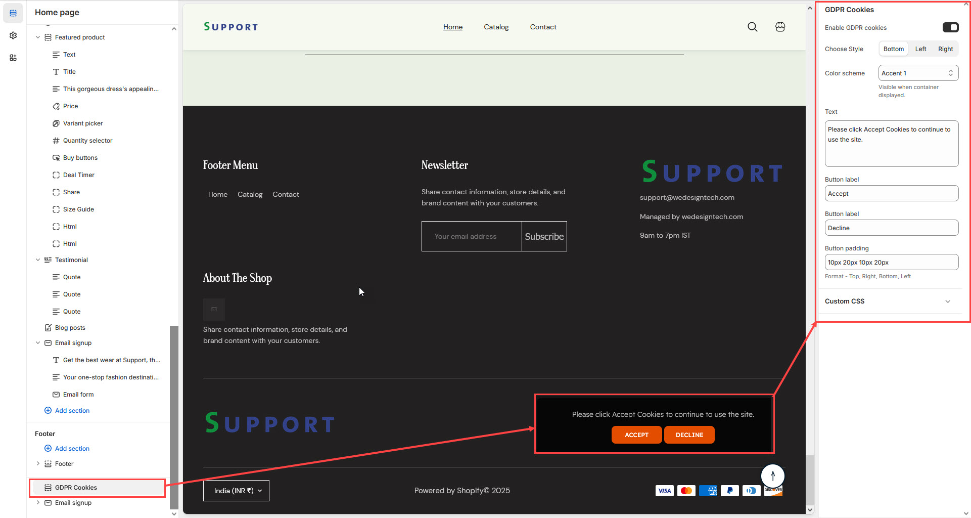 The GDPR Cookies Block in the Footer Section allows you to display a cookie consent banner, ensuring compliance with General Data Protection Regulation (GDPR) laws by informing visitors about cookie usage on your store.