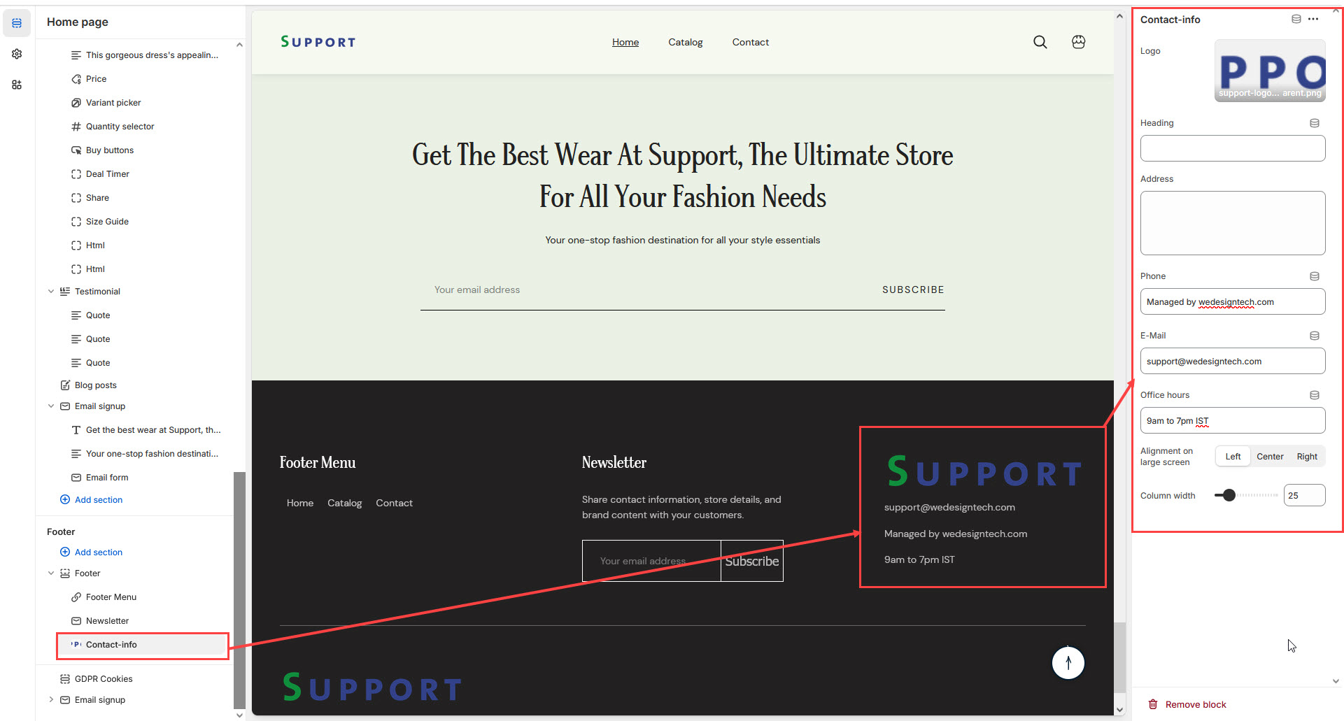 The Contact Info Block in the Footer Section allows you to display your store’s address, phone number, email, and office hours, making it easy for customers to get in touch with you.