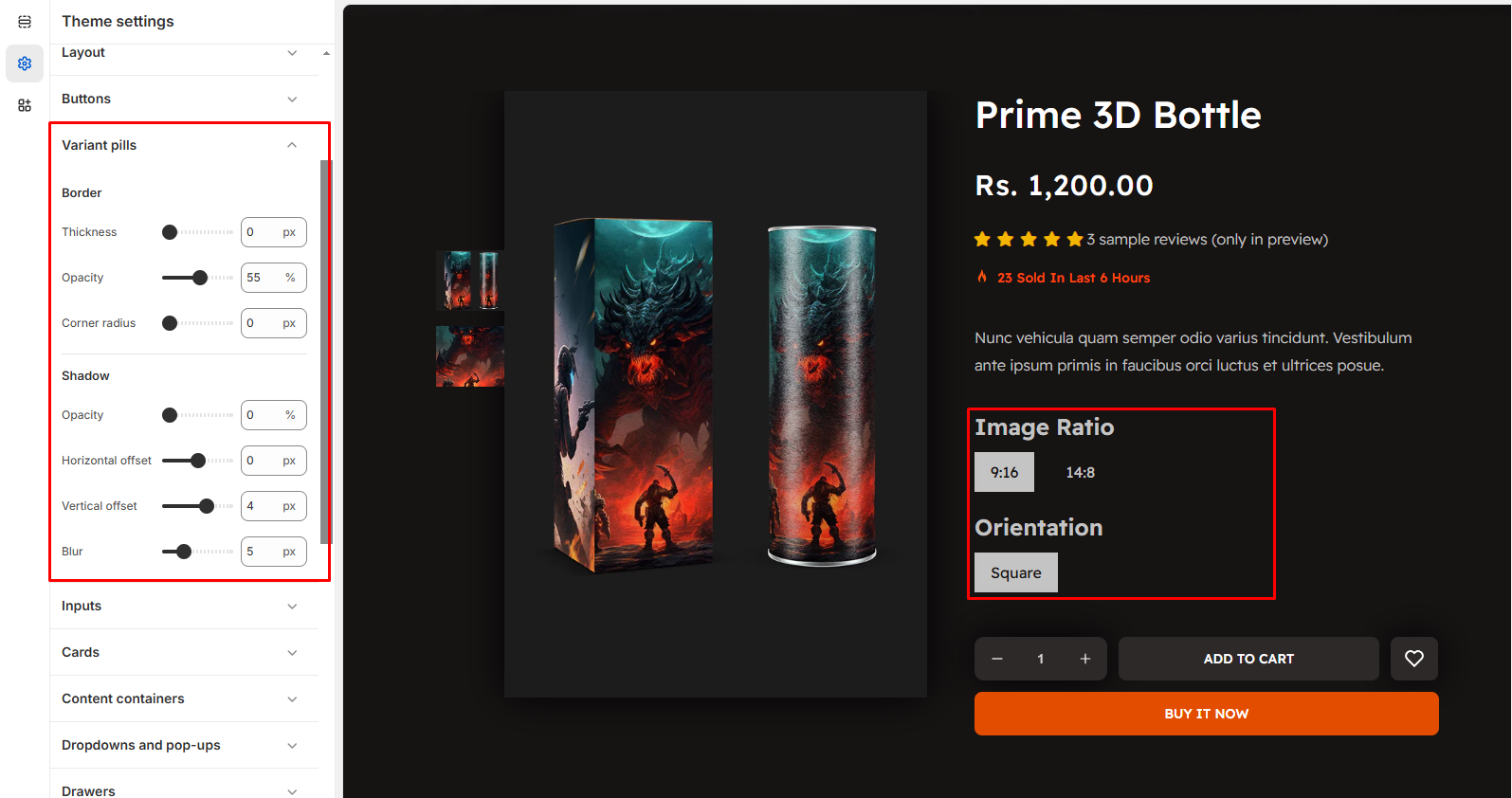 When you adjust the Variant Pills settings in Shopify's theme editor, the following changes occur in the styling of variant buttons on the product page. Below is a breakdown of each option and its effect:
