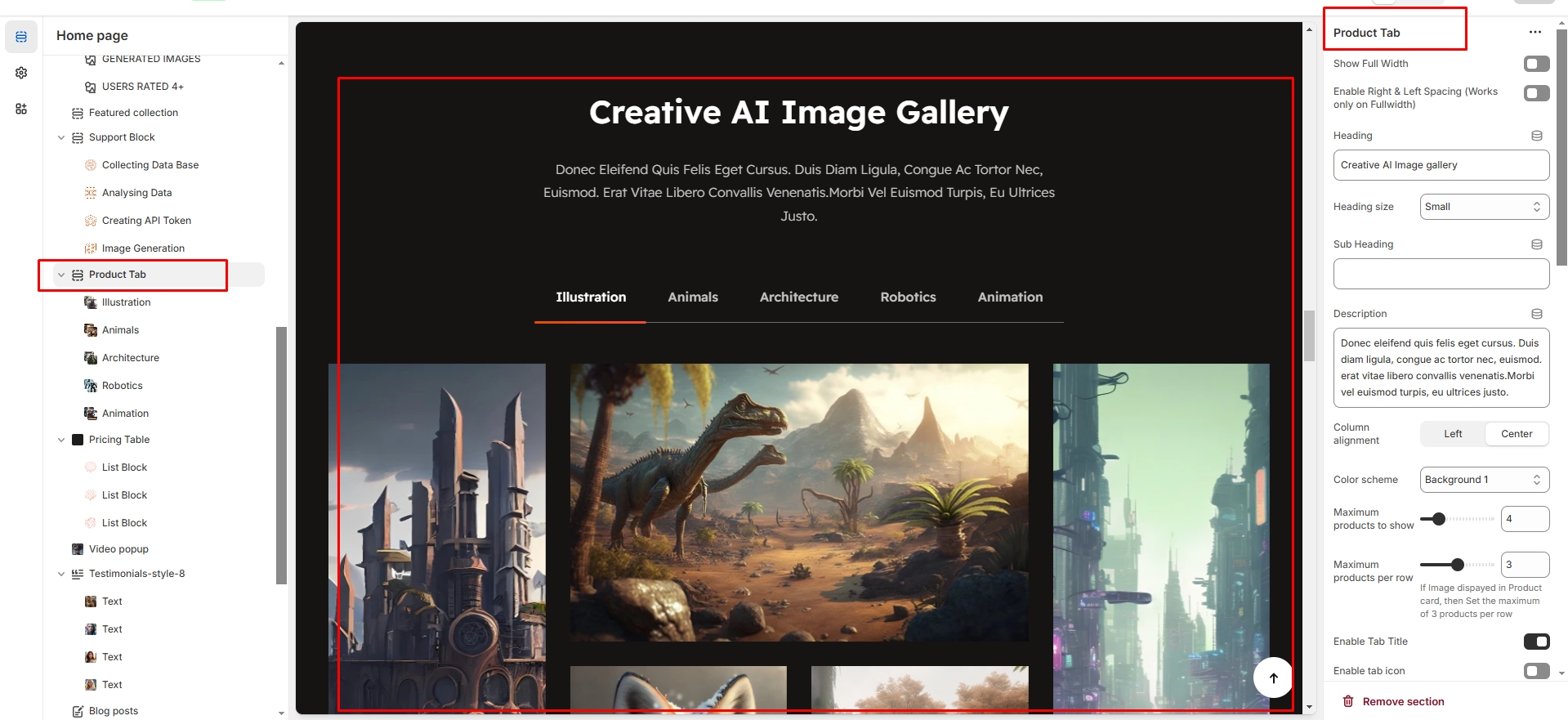 The Product Tab Section allows you to organize and display detailed information about your product in separate tabs . Below are the available customization options: