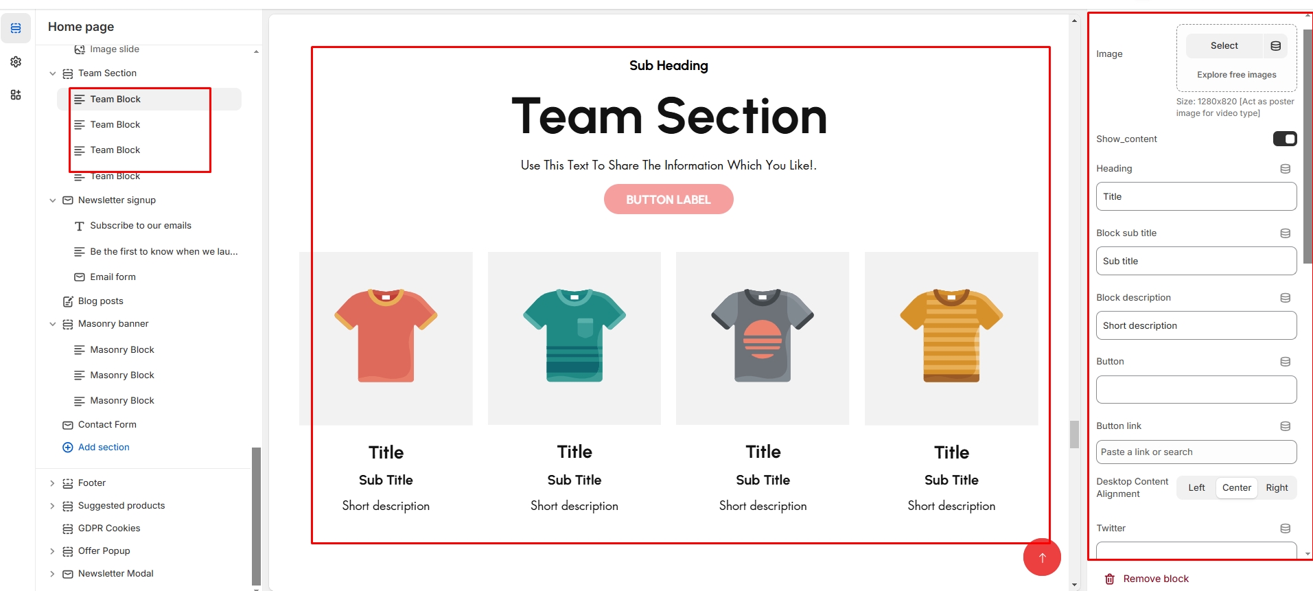 A Team Section in Shopify allows you to showcase the members of your team, adding a personal touch to your store and building trust with customers. This section typically includes photos, names, job titles, and brief bios of your team members.